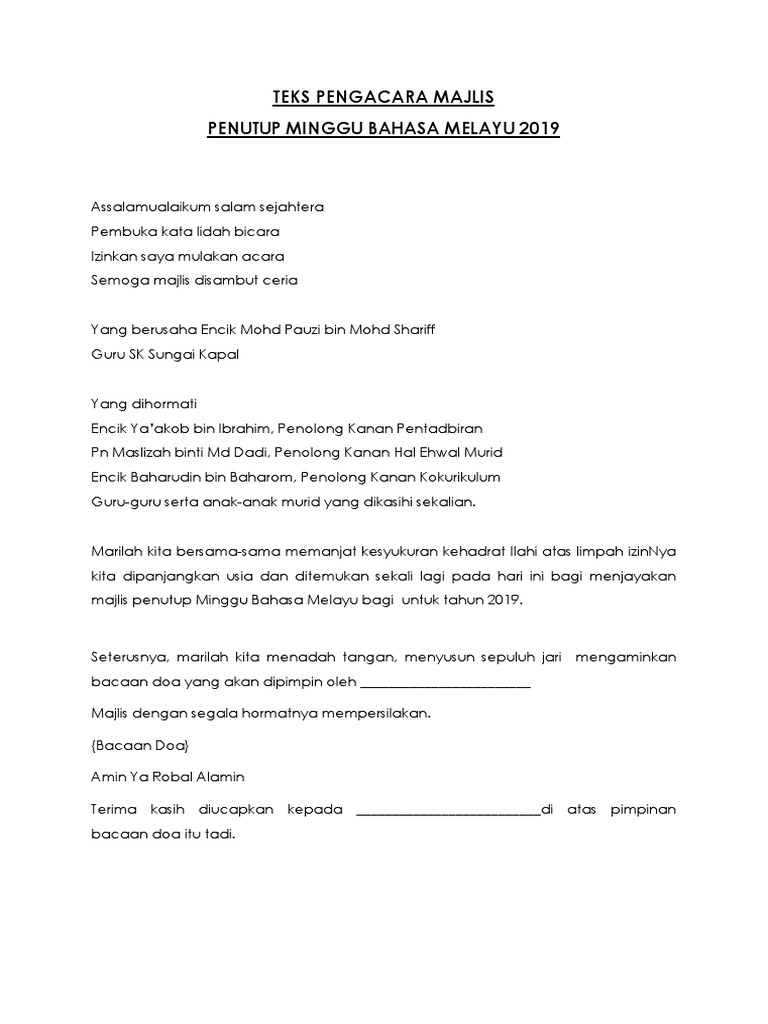 Doa Pembuka Majlis teks ucapan pengerusi majlis contoh bacaan doa majlis yang mudah dan ringkas azhan co nama saya nadia blog blog perubatan islam cintailah bahasa kita skrip pengacara majlis mesyuarat teks pengacara majlis khatam al quran sk sahabat 16 sudirman haji arshad wikipedia bahasa melayu wanita indonesia. Majlis dengan segala hormatnya mempersilakan. Popular Posts Teks Ucapan Pengerusi Majlis Bacaan Yasin.